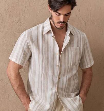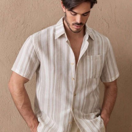 HIMLAND Men’s Plaid Short Sleeve Single-Breasted Casual Shirt Men’s Striped Short Sleeve Button-Up Casual Shirt Casual Button Down Shirt With Horse Embroidery Summer Beach Wedding Collarless Blue Striped Top Lightweight Breathable Blue Striped Grandad Shirt Slim Fit Solid Blue Striped Texture Blouse Slim Fit Blue Striped Summer Essential Men’s Blue Striped Shirts Out Pattern, For Vacation, Beach For Husband Boyfriend Gift Simple Fashion Commuting