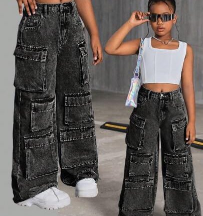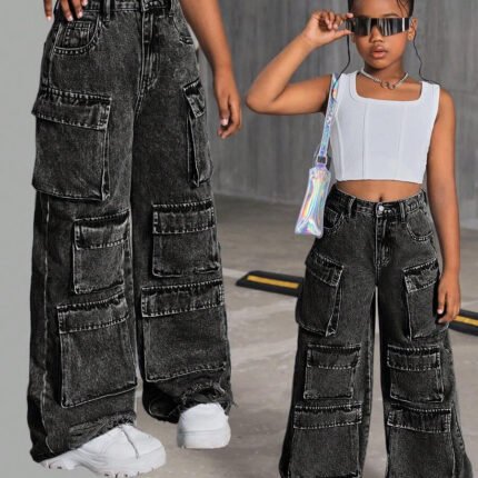 SHEIN Tween Girl Y2K Fashion Stone-Washed Multi-Pocket Distressed Cargo Jeans Baggy Wide Leg Pants, Fall Clothes Back To School