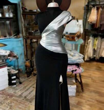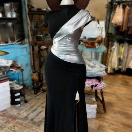 Rafferiza Elegant Black And Silver-Coated Fishtail Maxi Dress With A High Neck, Fitted Waist, And High Slit. Suitable For Summer, Carnival, And Party Occasions. Features Include A Black And Silver Coating, A Sexy High Slit, A Fitted Silhouette, Cap Sleeves, A High Neck, Short Sleeves, And A Unique, Shimmering Design.Turkish Abaya, Arab Long Robe Fall Summer For Women