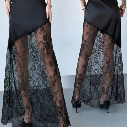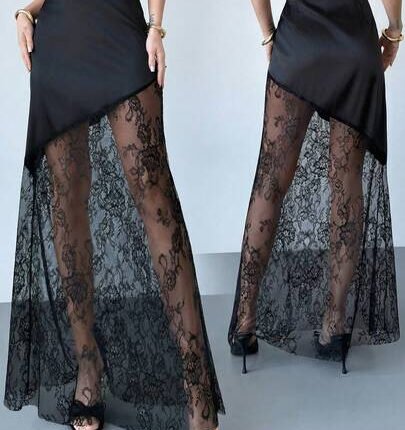 Women’s Satin Lace Patchwork Skirt – Elegant High Waist Sheer Black Skirt