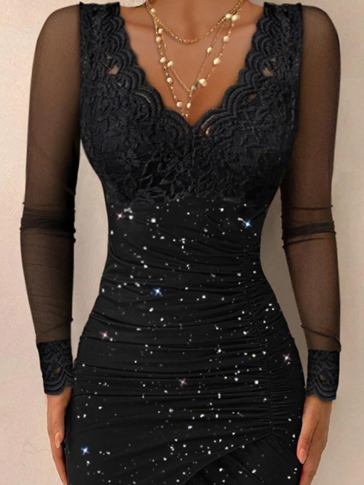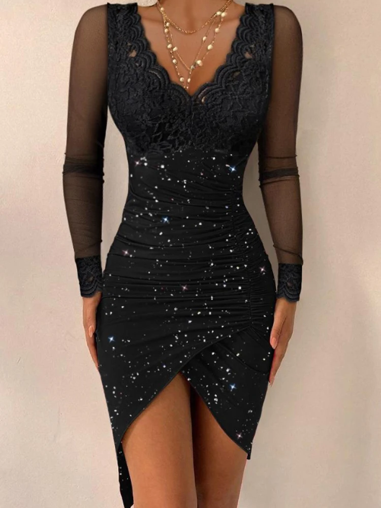 Women V-Neck Lace Long Sleeve Ruched Glitter Party Bodycon Dress