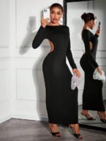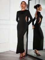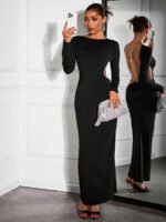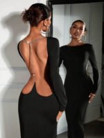 Make a bold statement in this black open back diamond chain bodycon dress ✨ Designed with a sleek slim fit, elegant long sleeves, and eye-catching rhinestone chain detail, this dress is perfect for night outs, parties, and formal occasions.