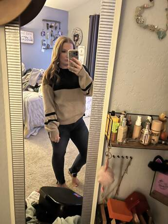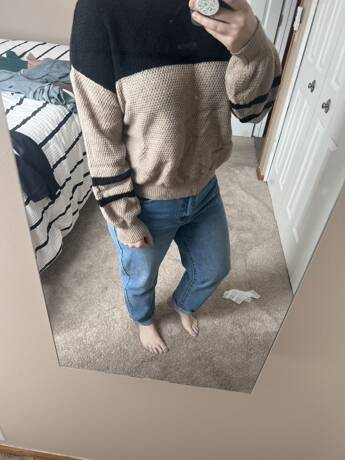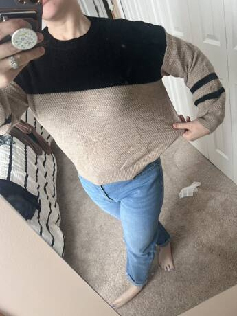 So cute and very fluffy and stretchy, but still brings you in. I usually get a large when buying sweaters but I decided with this material to go for a medium and it was a great idea. It looks even better.