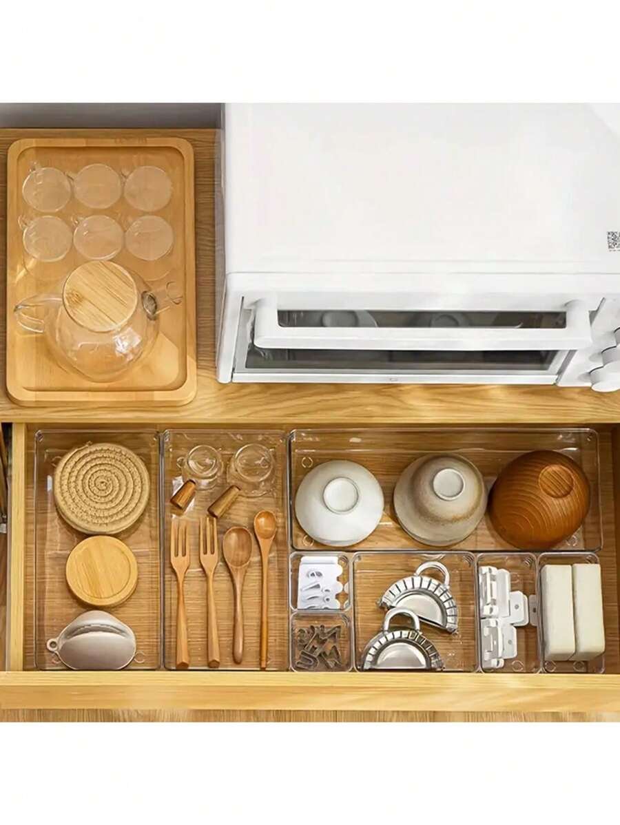 Keep your home organized with this Clear Plastic Drawer Organizer Set made from durable PET material. Available in multiple sizes (13/25/44pcs), these clear storage bins are perfect for bathroom, vanity, kitchen, bedroom, and office organization. The multi-size clear trays provide versatile storage for makeup, utensils, gadgets, and office supplies, helping you declutter efficiently. Lightweight, transparent, and easy to clean, these drawer organizers blend seamlessly with any decor while maximizing storage space. Ideal for home organization, desk organization, kitchen storage, and vanity organization.