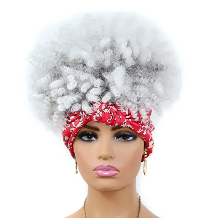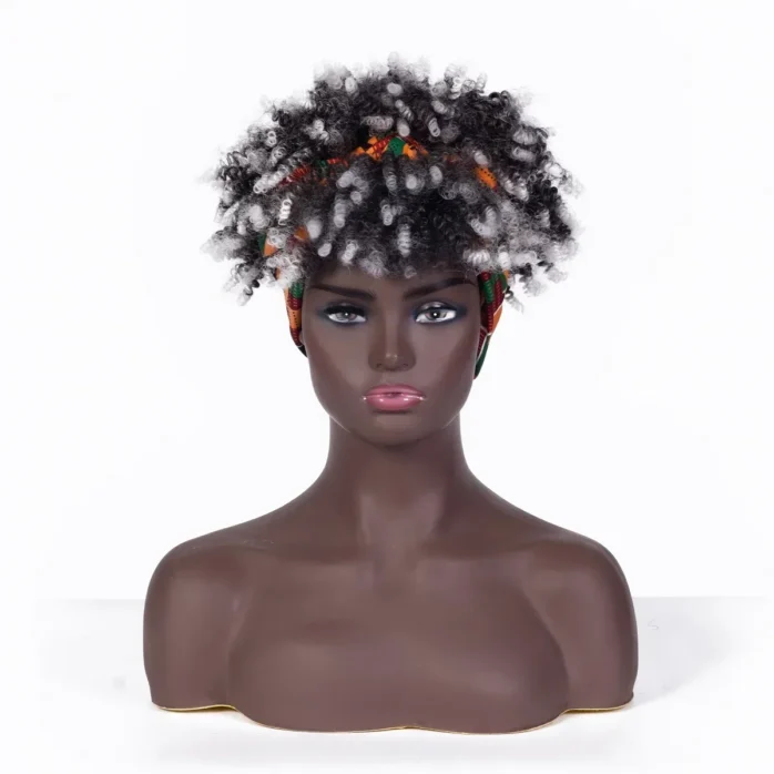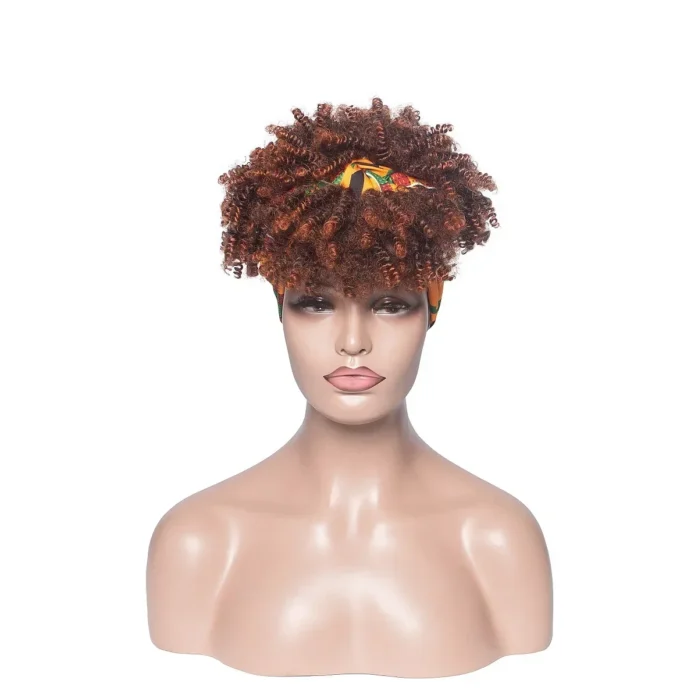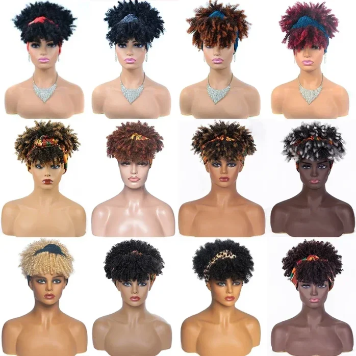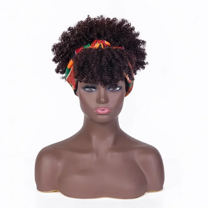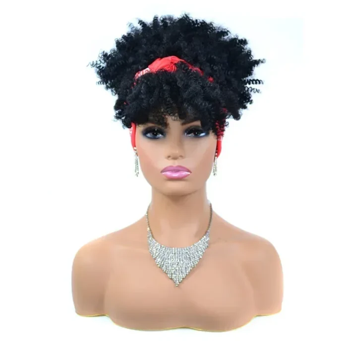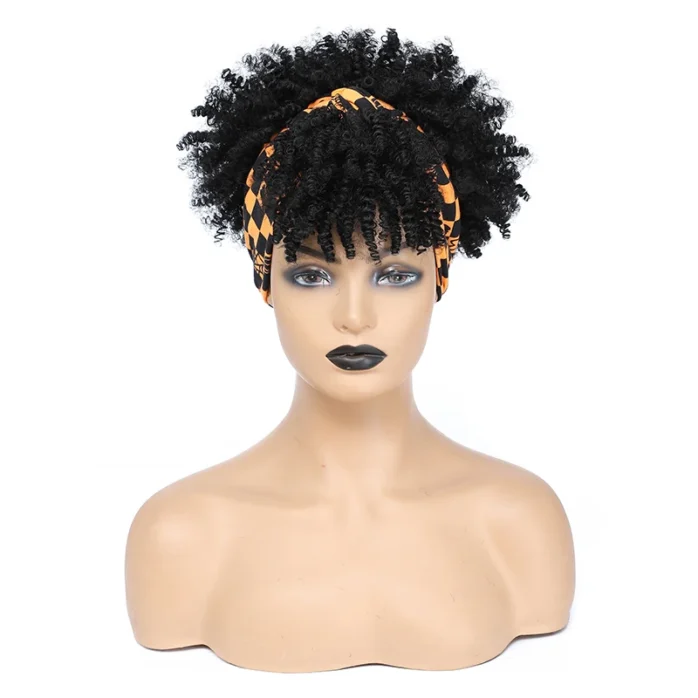 Hair Type: Short Afro Kinky Curly Wrap Wig 2 in 1, Afro Puff Headband Wig(Turban Wig)