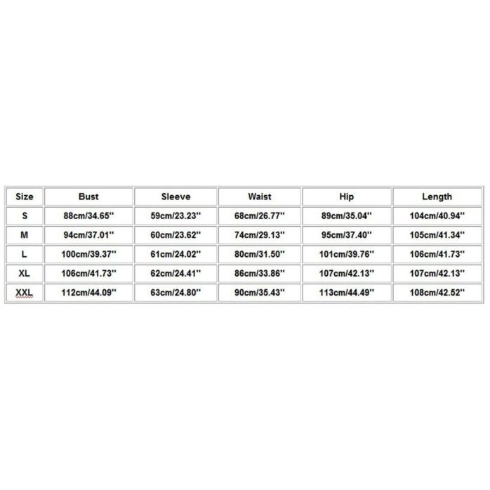 Size:XL Bust:106cm/41.73” Sleeve:62cm/24.41” Waist:86cm/33.86” Hip:107cm/42.13” Length:107cm/42.13”