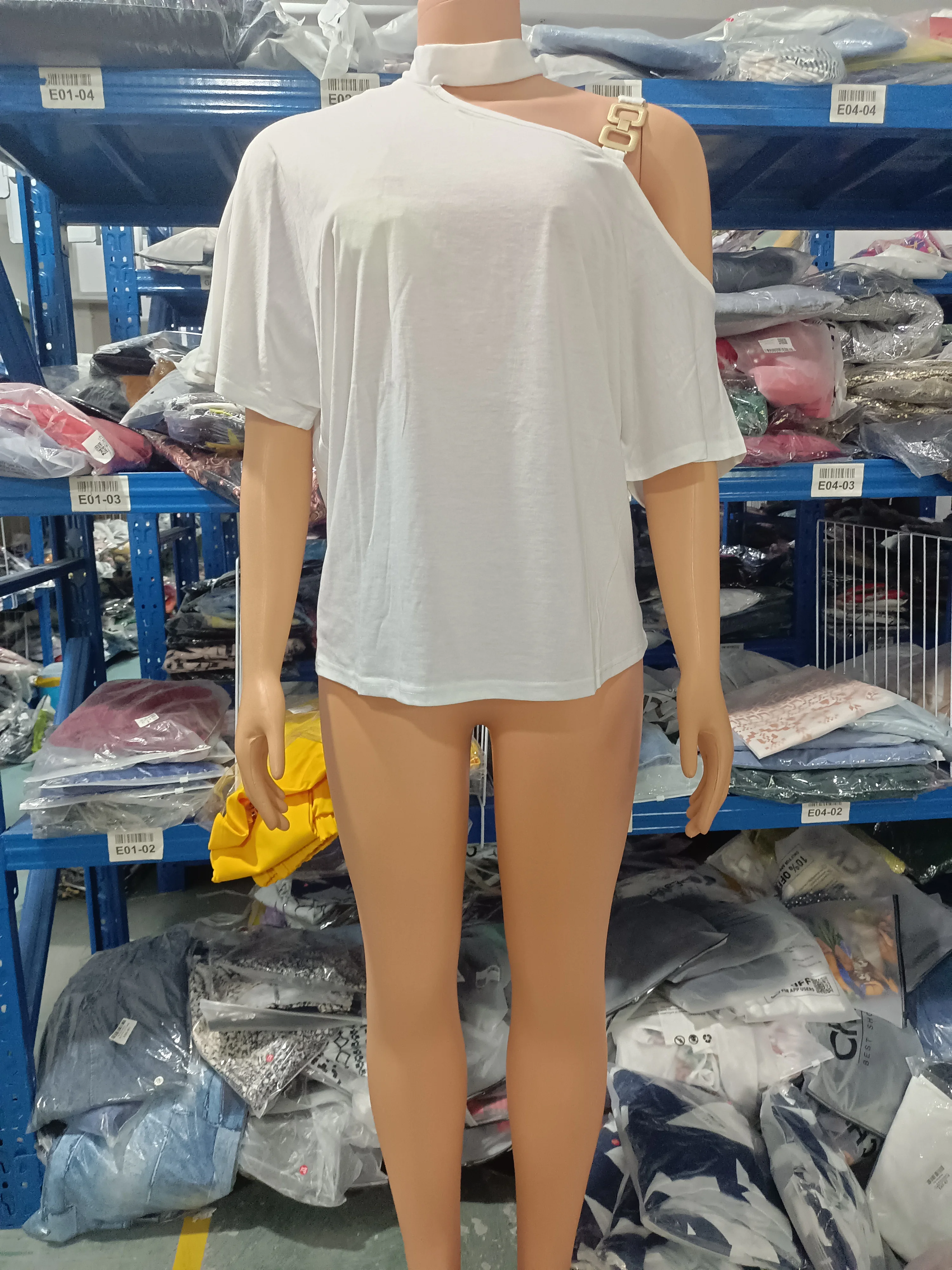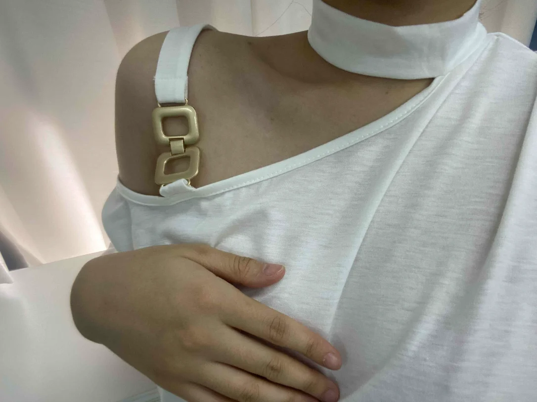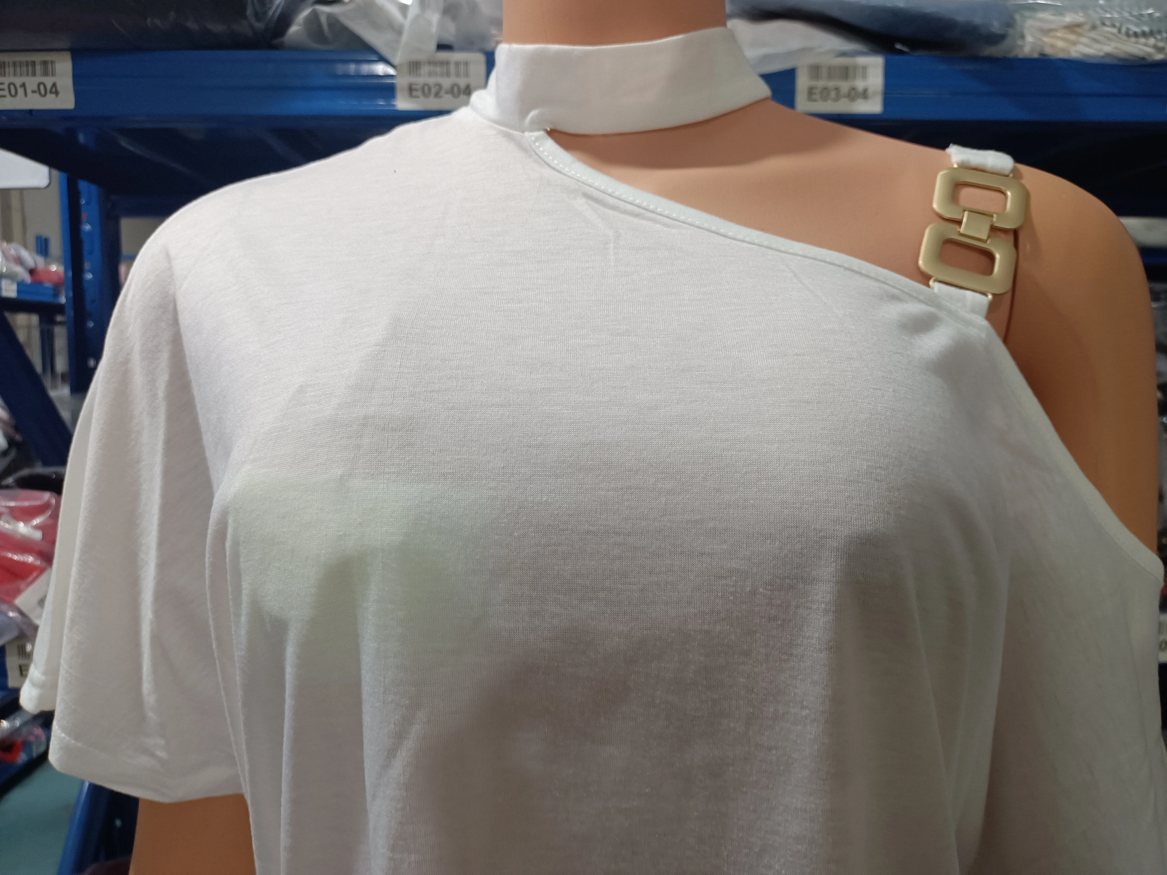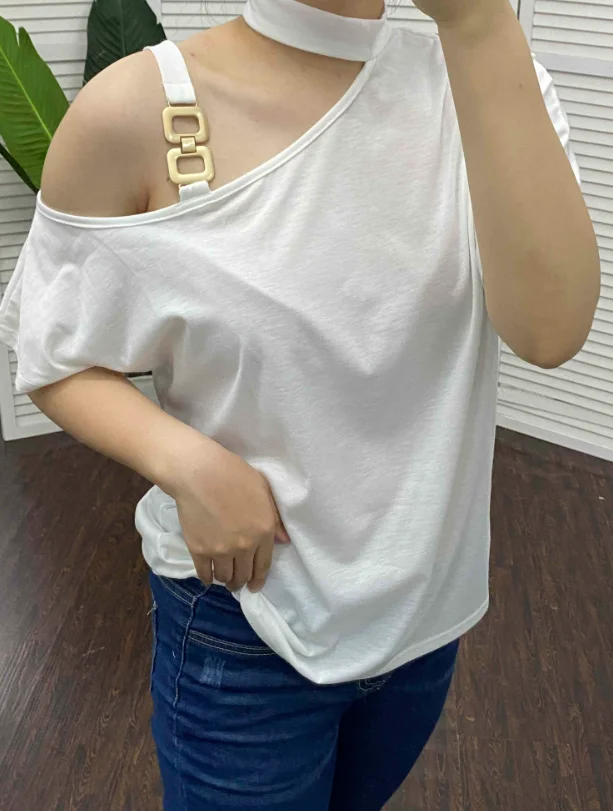 Metal Decorative Cold Shoulder Women’s Top 2023 Summer Fashion White T-shirt Casual T-shirt