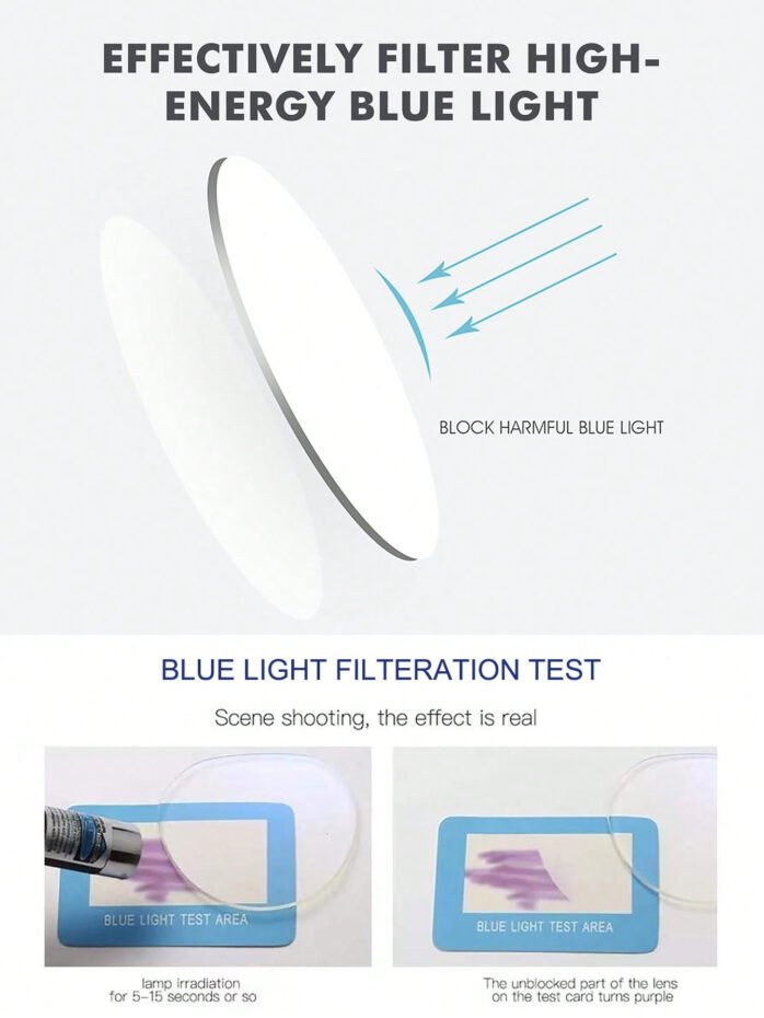 The lenses are made from PC (Polycarbonate), known for its durability and impact resistance. These lenses provide clear vision while effectively blocking harmful blue light emitted from screens. This is essential for reducing eye strain and preventing long-term damage caused by prolonged screen time.