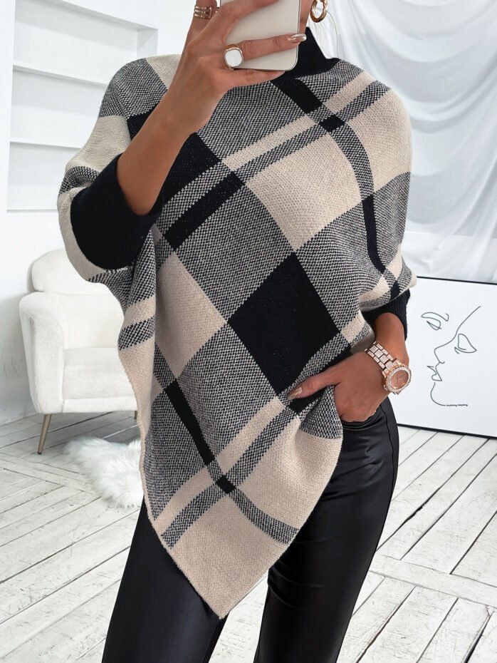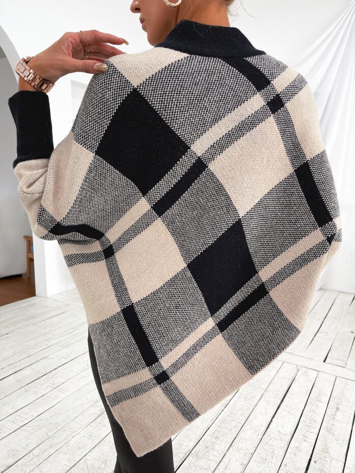 Mock Neck Plaid Knit Poncho