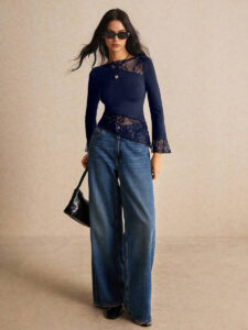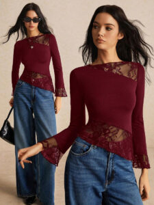 Step out in style with this Navy Blue Asymmetric Lace T-Shirt, a must-have for every woman’s wardrobe this season. Designed with a flutter hem, contrast lace detail, and a flattering boat neckline, this top perfectly blends elegance and comfort.