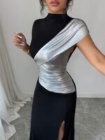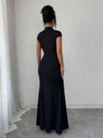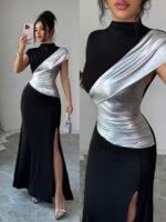 Rafferiza Elegant Black And Silver-Coated Fishtail Maxi Dress With A High Neck, Fitted Waist, And High Slit. Suitable For Summer, Carnival, And Party Occasions. Features Include A Black And Silver Coating, A Sexy High Slit, A Fitted Silhouette, Cap Sleeves, A High Neck, Short Sleeves, And A Unique, Shimmering Design.Turkish Abaya, Arab Long Robe Fall Summer For Women