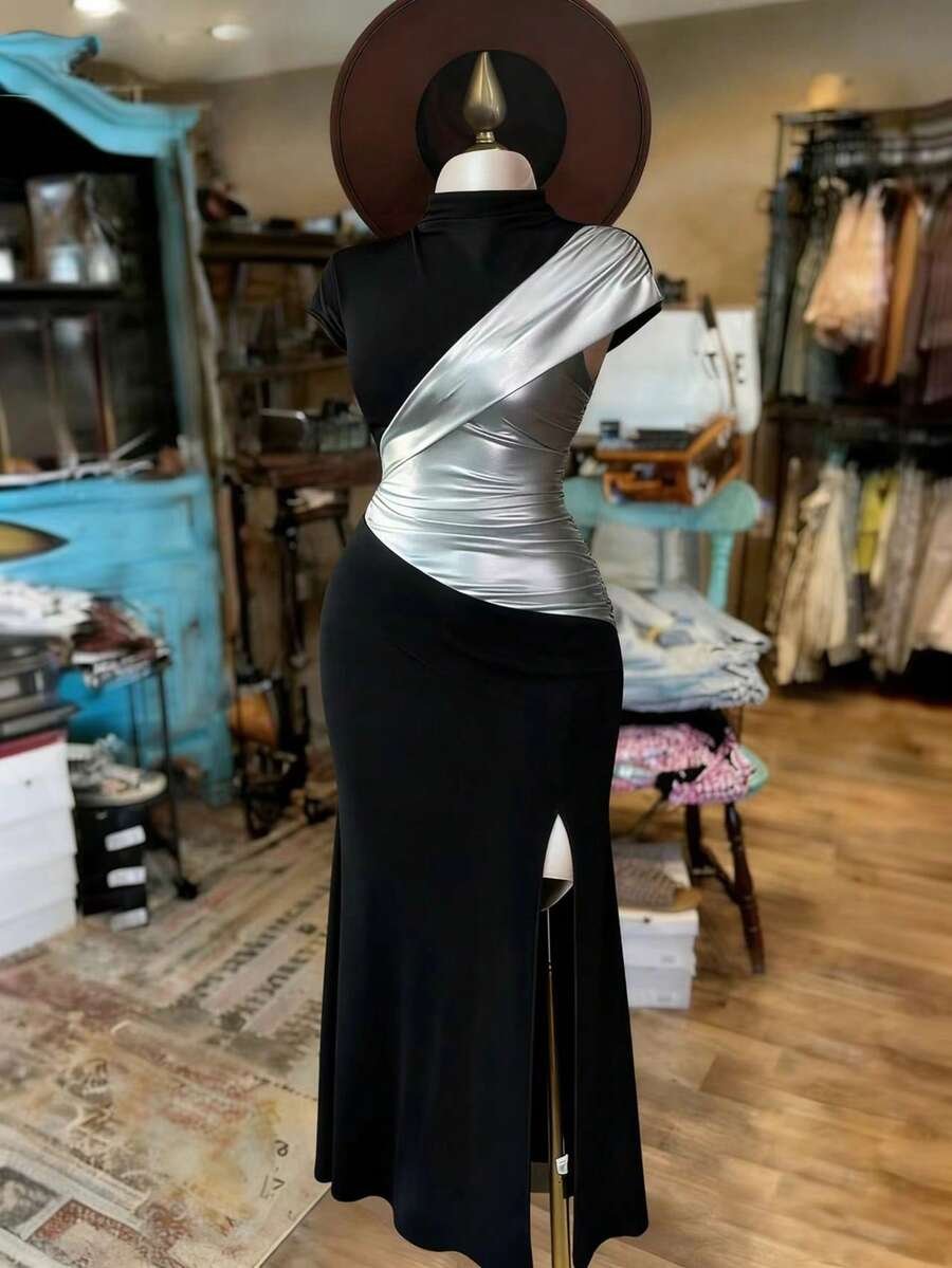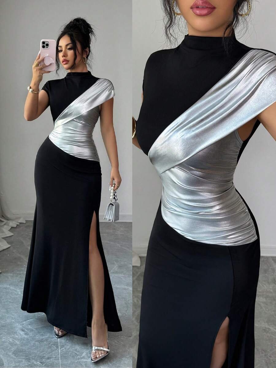 Rafferiza Elegant Black And Silver-Coated Fishtail Maxi Dress With A High Neck, Fitted Waist, And High Slit. Suitable For Summer, Carnival, And Party Occasions. Features Include A Black And Silver Coating, A Sexy High Slit, A Fitted Silhouette, Cap Sleeves, A High Neck, Short Sleeves, And A Unique, Shimmering Design.Turkish Abaya, Arab Long Robe Fall Summer For Women