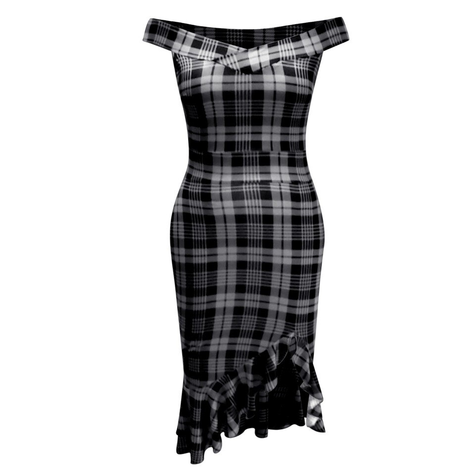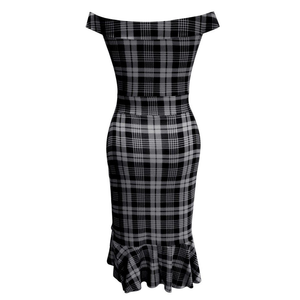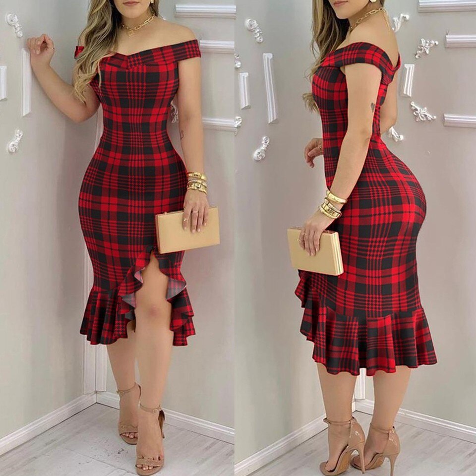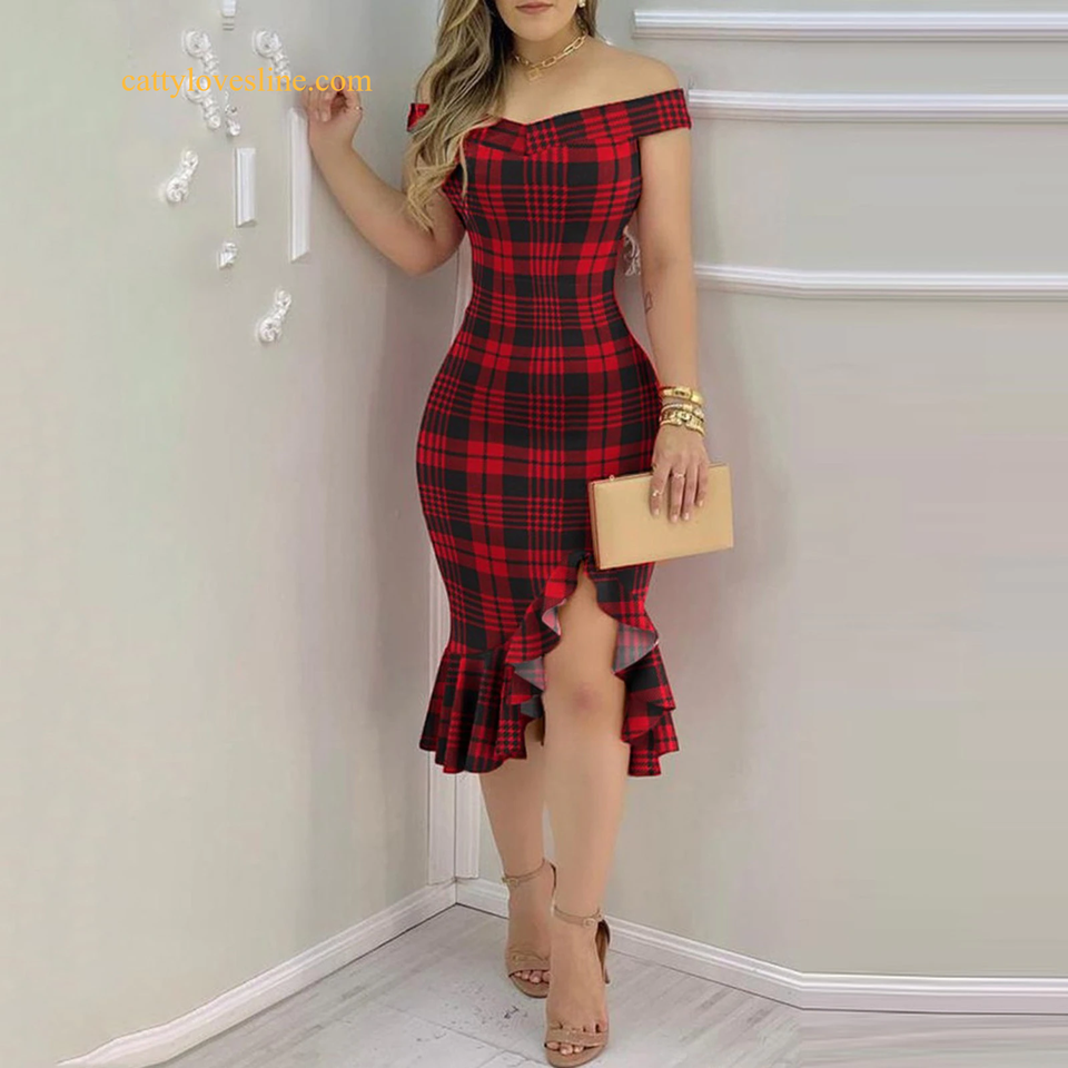 Women Fashion Plaid Dress Plain Cold Shoulder Ruffle Loose Hem Slit Dress
