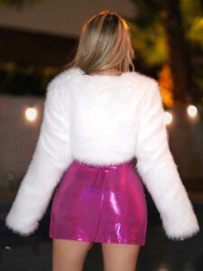 Designed for night out fashion and trendy winter wear, this fuzzy white crop jacket combines comfort and style. Lightweight yet insulating, it is unlined with 100% polyester lining, machine washable, and easy to care for. Ideal for pairing with skirts, pants, or layered over bodycon dresses for a chic winter look.