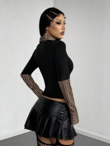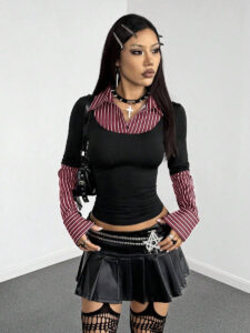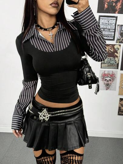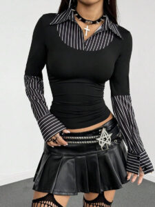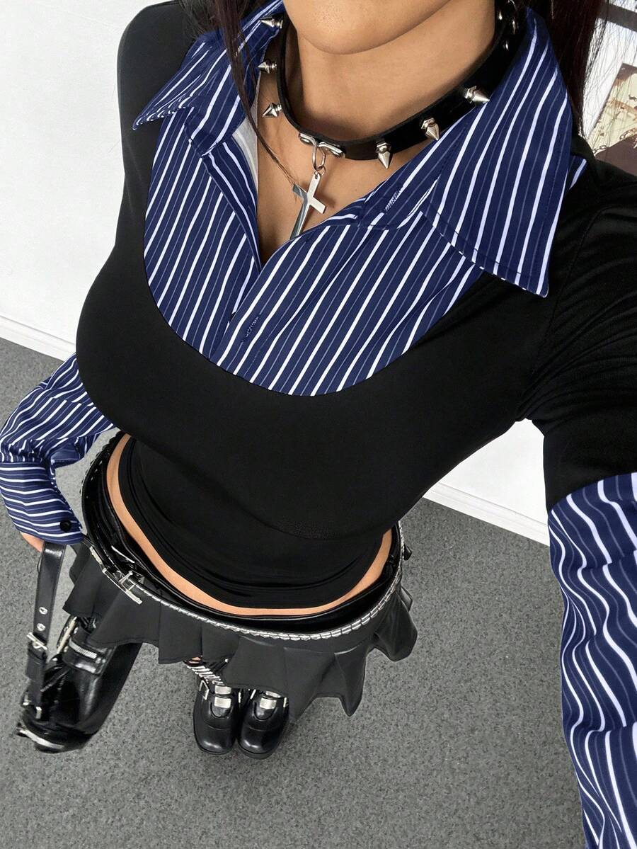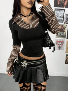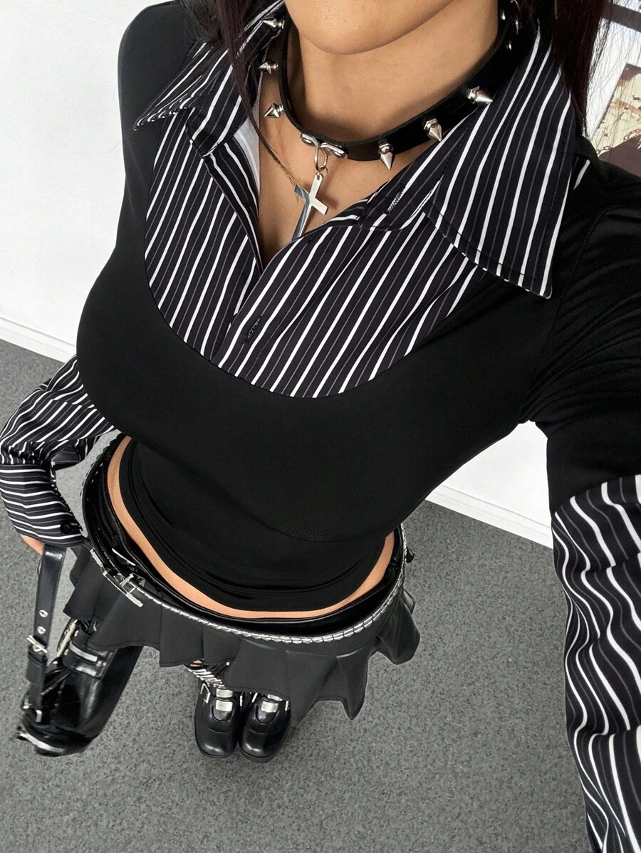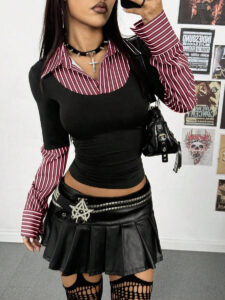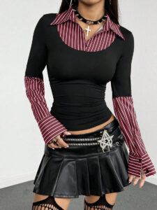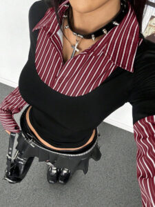 StreetHx Women’s Long Sleeve Striped Patchwork Long Sleeve Blouse, Punk Style For Everyday Wear Fall Cloth For Women