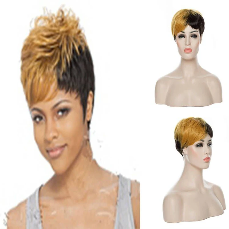 Mixed Dark Glonde Brown Wig for Black Women Natural Synthetic Short Pixie Cut Wigs with Bangs Heat Resistant Cosplay Daily
