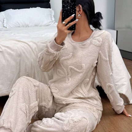 Women’s Crew Neck Bow Jacquard Fleece Long Sleeve Top And Drawstring Pants Loungewear Set, Autumn/Winter, Cozy Clothes, Fluffy